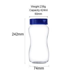 New design instant coffee glass jar, height is 242mm, mouth diameter is 60mm, capacity is 424ml, which is made of food grade glass material. Break with tradition and have a unique slim waist design, smooth and delectable bottle line, like an elegant lady, easy for holding. Unique anti-slip design on the bottom of the bottle, which makes bottle stand stablely. The mouth of coffee jar is wide enough so can pour out coffee bean or instant coffee easily. It matches with dazzling blue plastic cap,cap with holes, which can help you control how much you will pour.