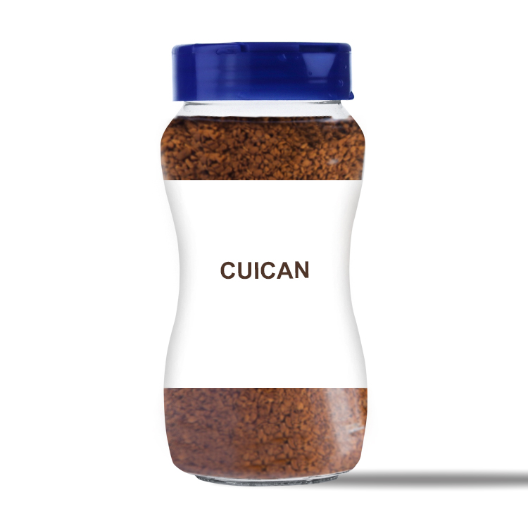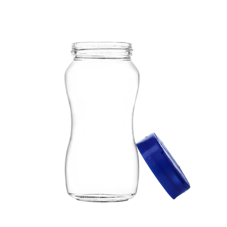 New design instant coffee glass jar, height is 242mm, mouth diameter is 60mm, capacity is 424ml, which is made of food grade glass material. Break with tradition and have a unique slim waist design, smooth and delectable bottle line, like an elegant lady, easy for holding. Unique anti-slip design on the bottom of the bottle, which makes bottle stand stablely. The mouth of coffee jar is wide enough so can pour out coffee bean or instant coffee easily. It matches with dazzling blue plastic cap,cap with holes, which can help you control how much you will pour.