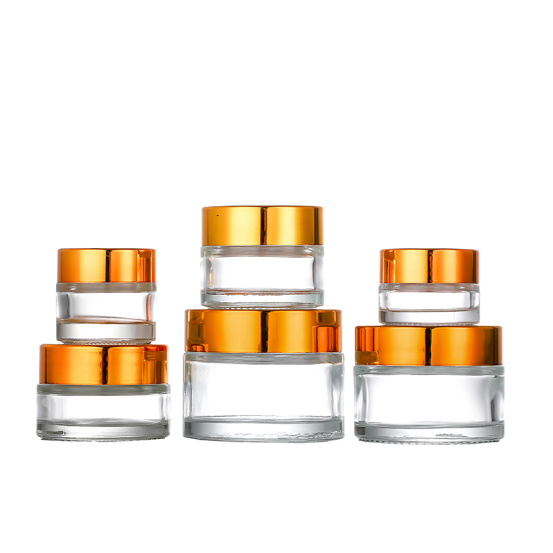 This elegant Glass Jars for Face Cream, topped with a lustrous golden lid, offers a luxurious storage solution for skincare and cosmetic products. Crafted from high-quality materials, it ensures durability and maintains the freshness of contents. Its sophisticated design not only enhances the aesthetic appeal of any vanity but also reflects a sense of quality and refinement, making it an ideal choice for those who value both functionality and style in their beauty regimen.