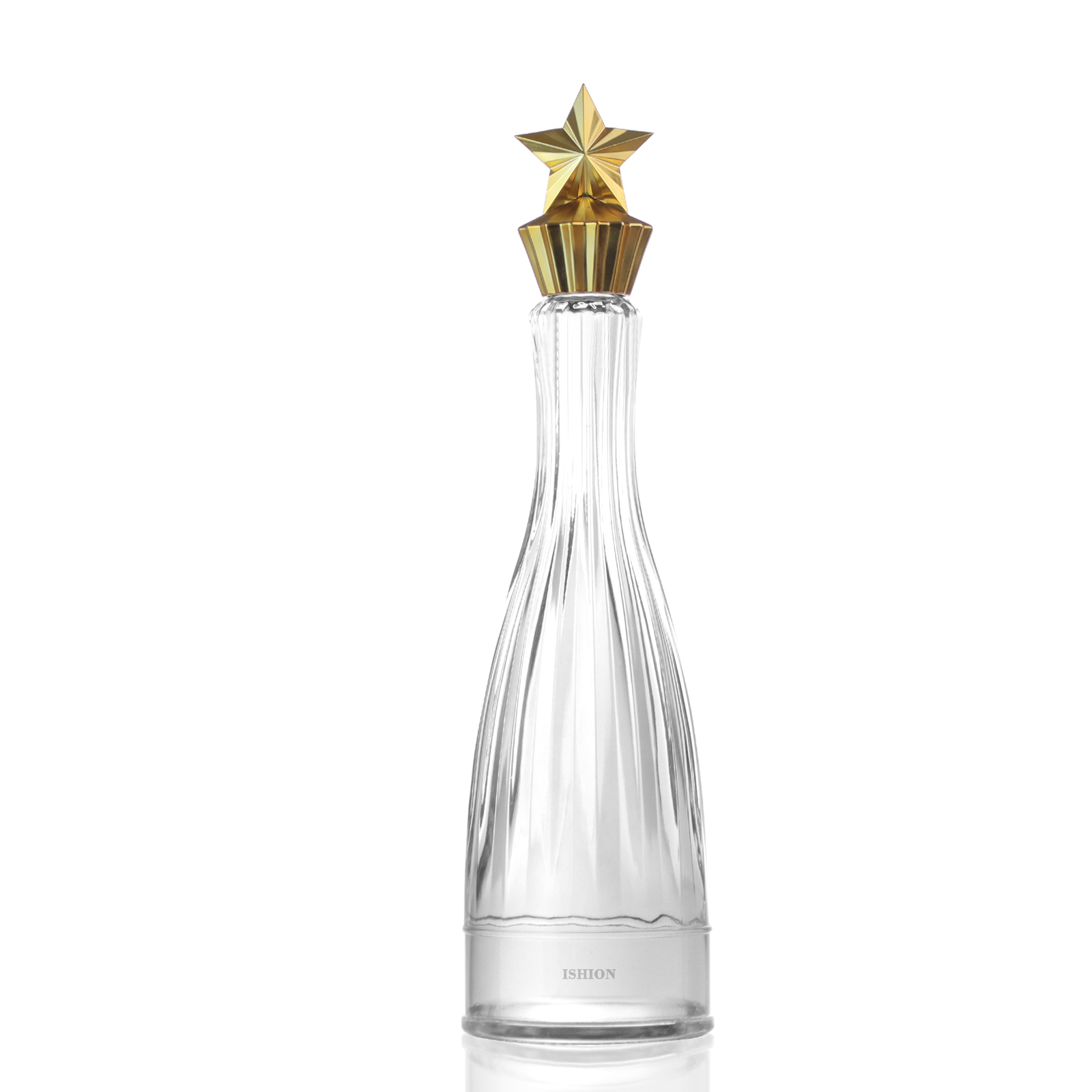 The 750ml Clear Wine Bottle boasts a sleek and elegant design that adds a touch of sophistication to any setting. Its clear glass allows the color and clarity of the wine to be displayed beautifully, enhancing the overall presentation. The fluted body and the star-shaped cap not only serve as a unique decorative element but also contribute to the bottle’s premium feel, making it an attractive centerpiece for any table.
