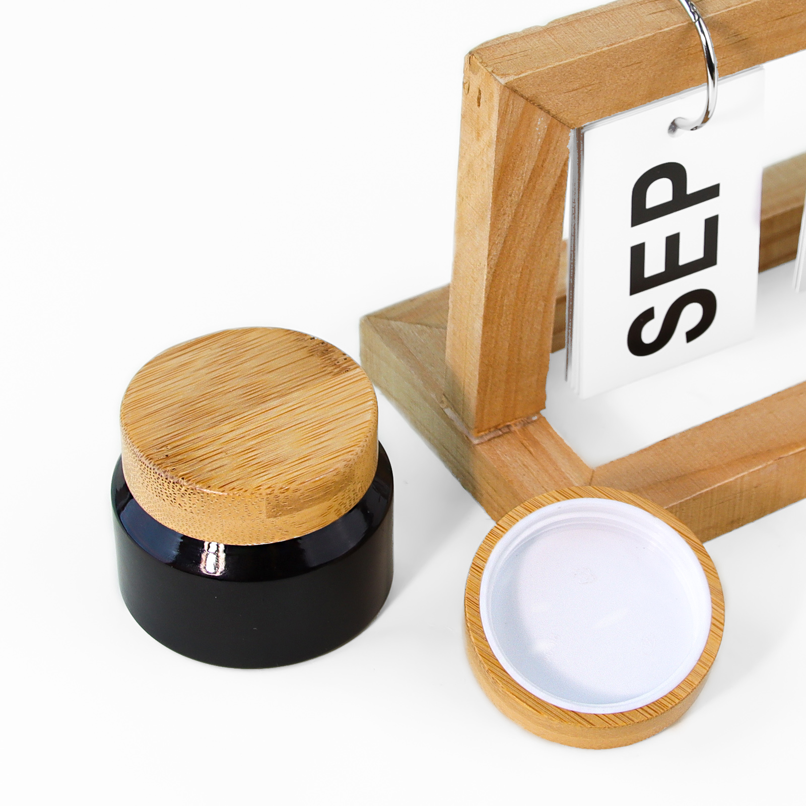 The product boasts a sophisticated design that seamlessly blends modern aesthetics with natural elements. The use of amber glass provides a premium look while also protecting the contents from UV light, ensuring the longevity and potency of the product inside. The wooden lids add a touch of rustic charm and are crafted from sustainable materials, appealing to eco-conscious consumers.
