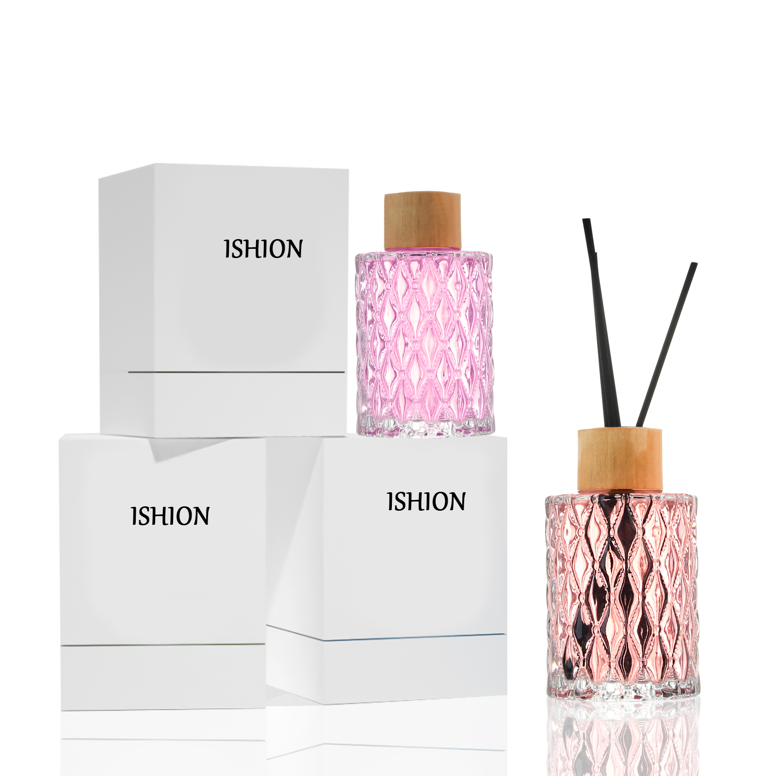 This Glass Reed Diffuser Bottle Wholesale boasts an elegant embossed design that adds a touch of sophistication and luxury to the product. The embossing not only enhances the visual appeal but also provides a tactile experience, making it a standout choice for aromatherapy and air freshness solutions.