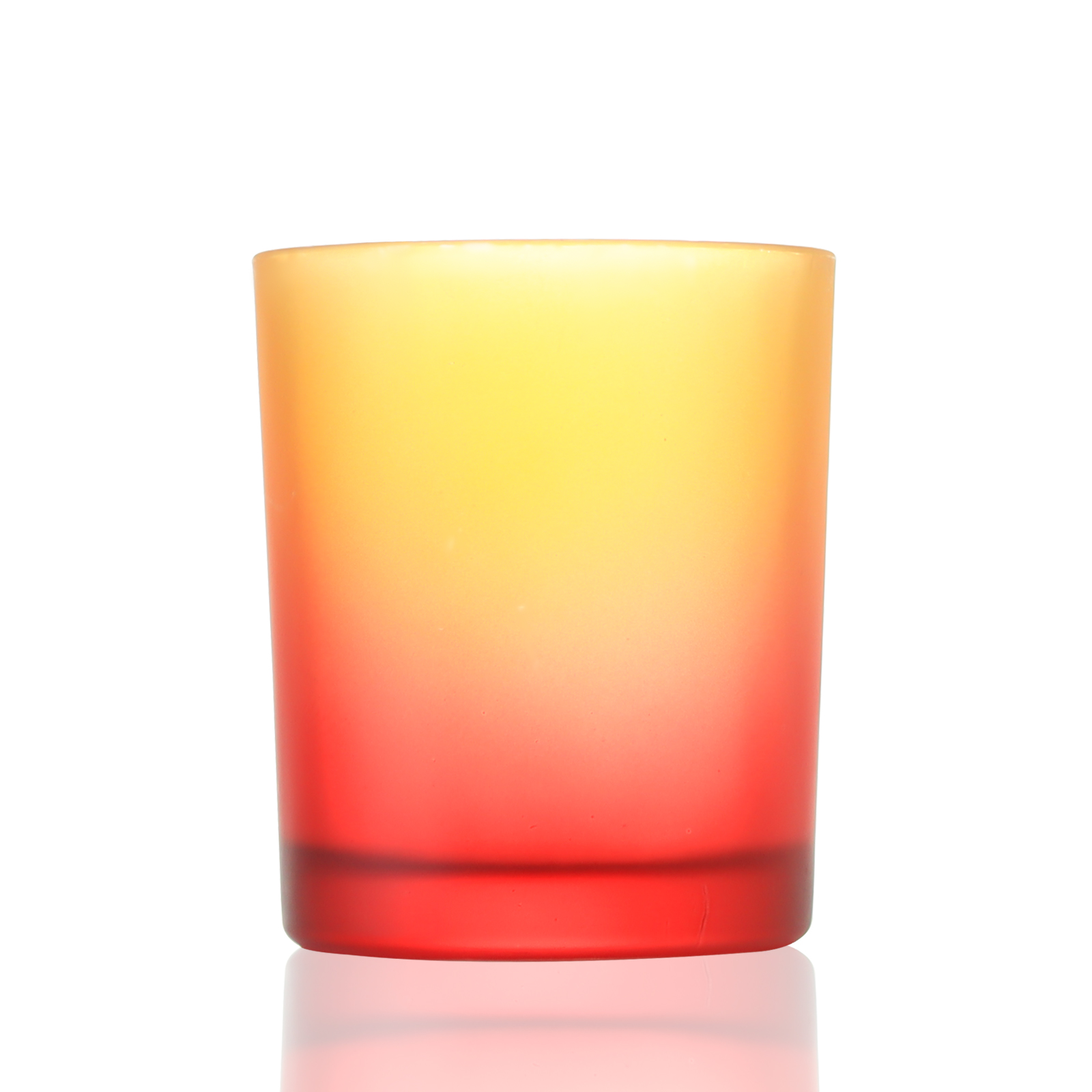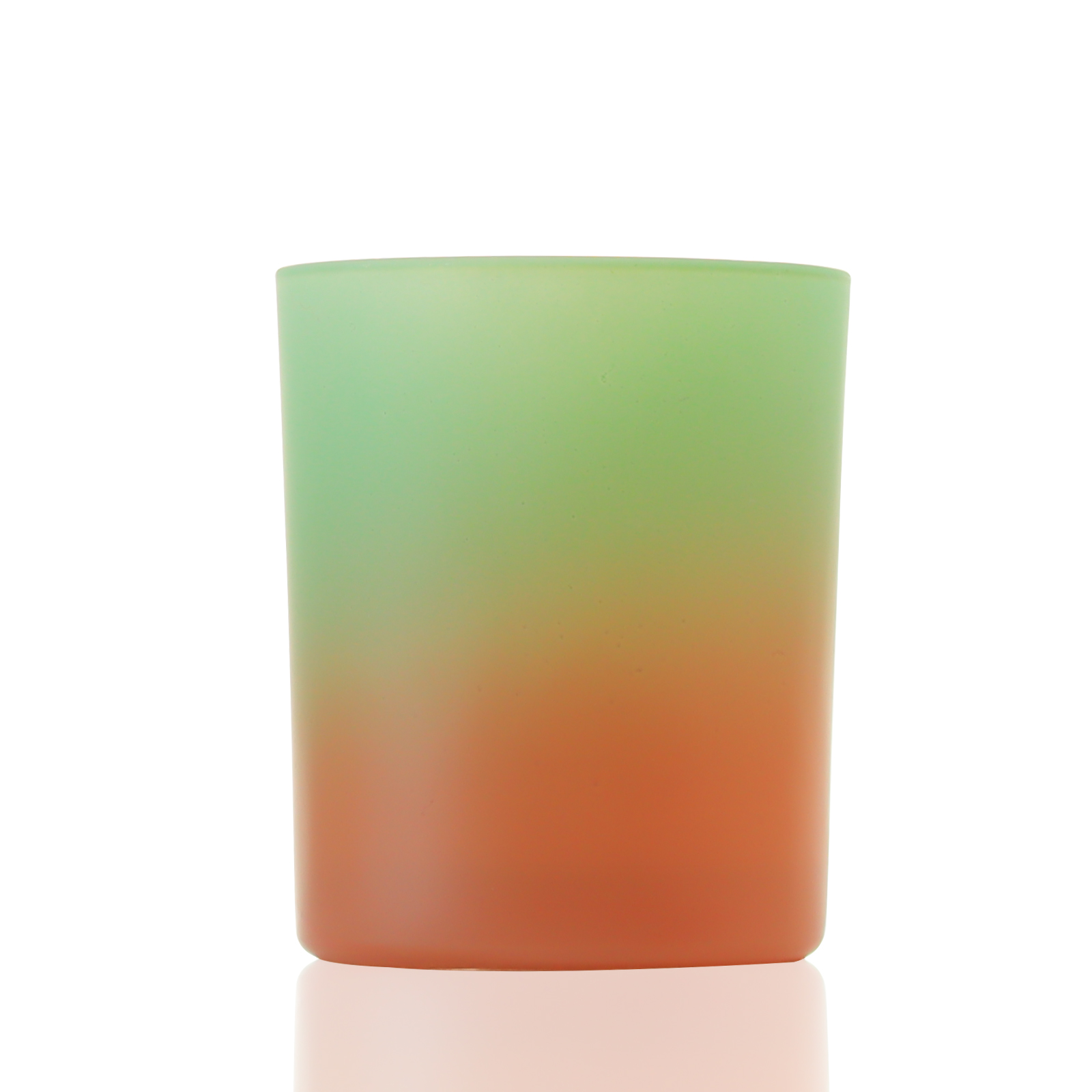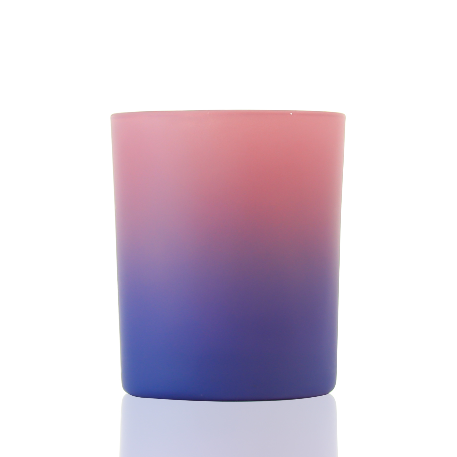 This New Design Empty Colored Glass Candle Container offers a unique selling point with its custom gradient color glass, allowing for a visually stunning and personalized appearance that can match various aesthetic preferences and themes.
