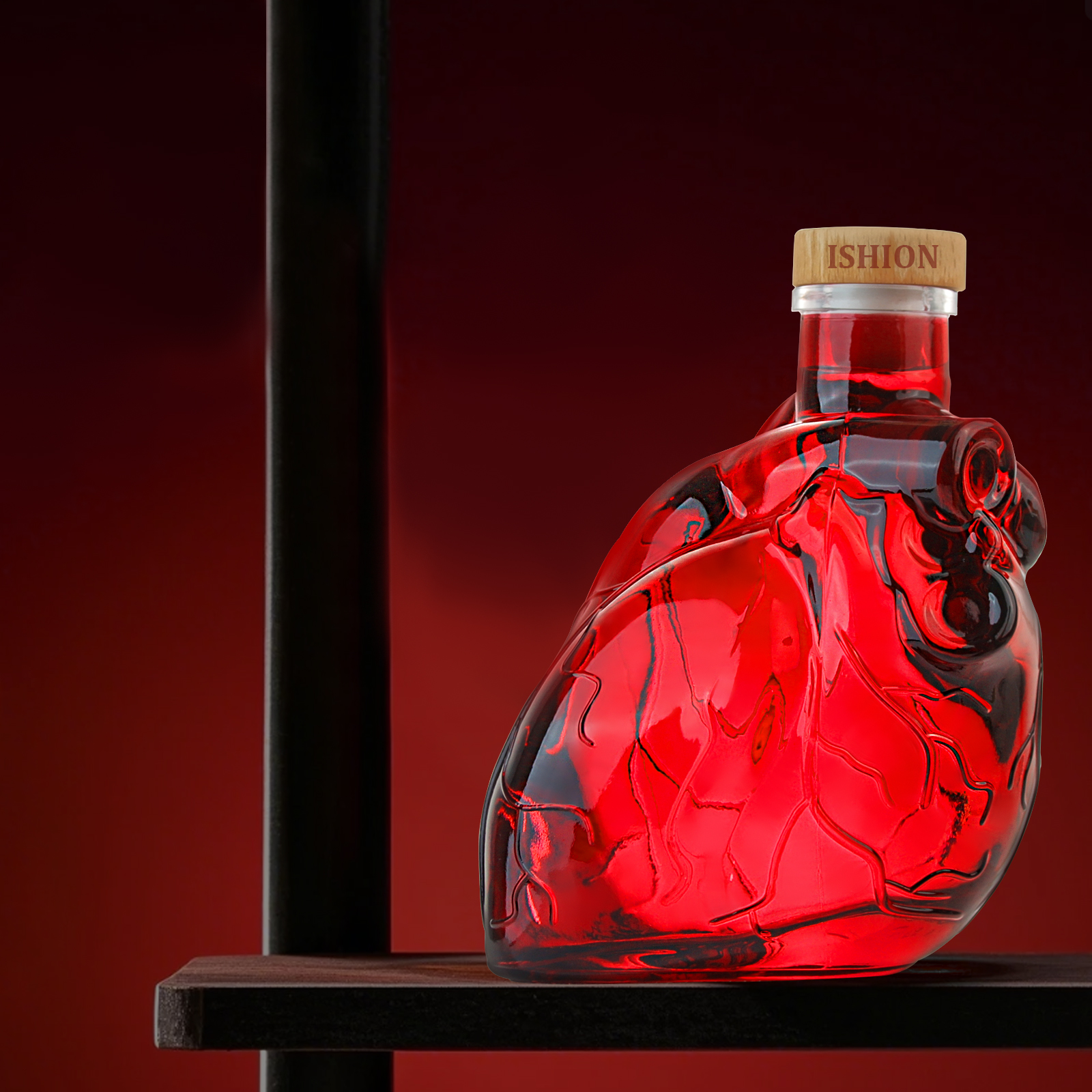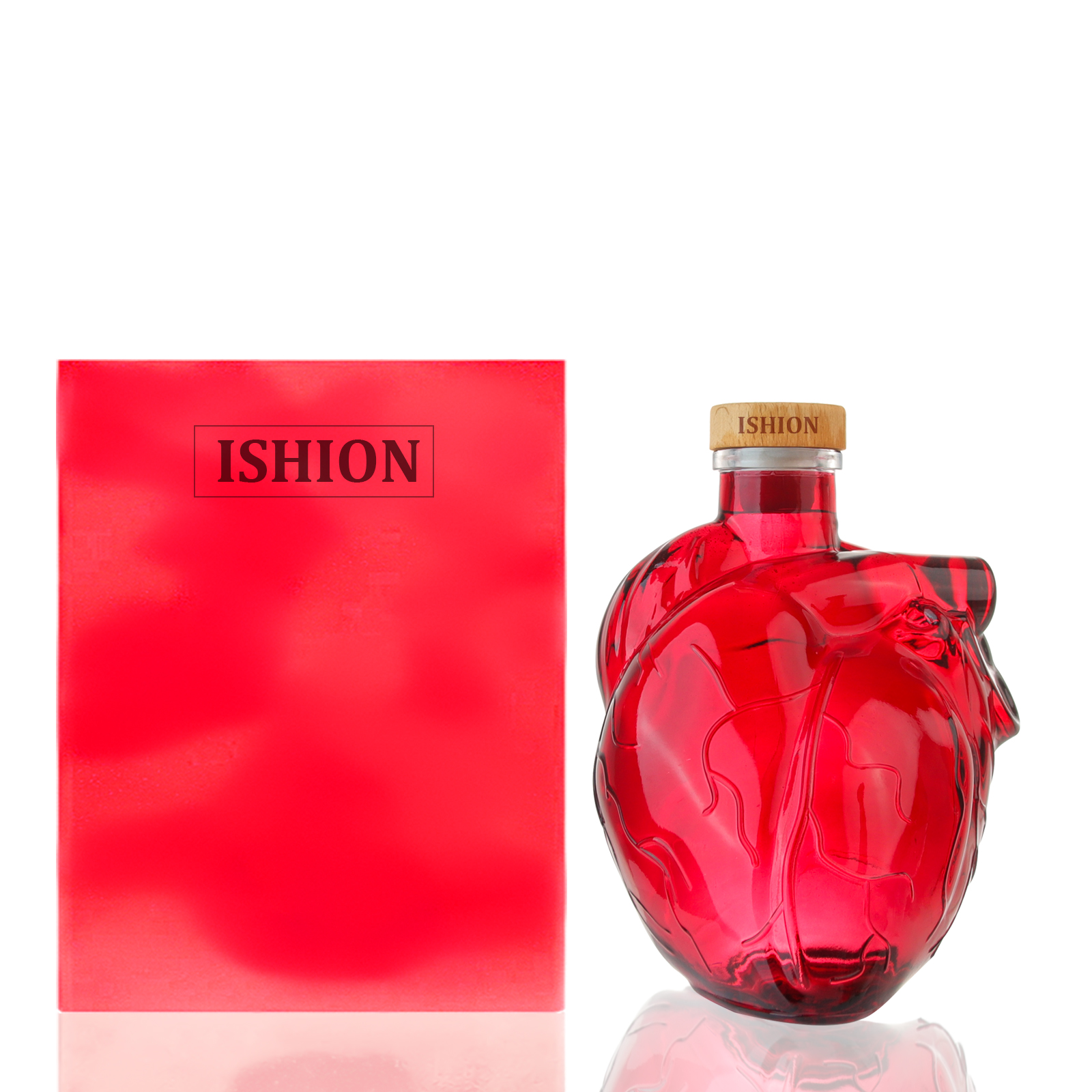 The bottle features prominent branding with the name “ISHION” displayed on both the bottle and the cork stopper, enhancing brand recognition and adding a professional touch. The accompanying red box with the brand name further elevates the presentation, making it an excellent gift option. The cohesive branding and packaging ensure that the bottle stands out on shelves and leaves a lasting impression on recipients.