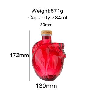 The 780ml Heart Shaped Glass Bottles Wholesale is a stunning piece of craftsmanship, featuring a vibrant red hue and a uniquely sculpted design that exudes elegance and sophistication. Made from high-quality glass, it ensures durability while maintaining the purity of its contents. The bottle’s eye-catching appearance, combined with its practical capacity, makes it an ideal choice for both personal use and as a thoughtful gift, promising to add a touch of luxury to any occasion.