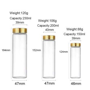Versatile Storage Options: These glass bottles come in three distinct sizes, offering a range of storage solutions for various needs. The largest bottle has a capacity of 230ml, making it ideal for storing larger quantities of items such as candies or snacks. The medium-sized bottle, with a capacity of 200ml, is perfect for nuts or small food items, while the smallest bottle, holding 150ml, is great for smaller quantities or travel-sized items. This variety ensures that you can find the right size for any storage requirement.