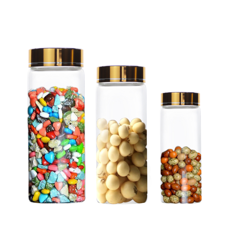 These elegant glass bottles are perfect for storing a variety of items, from candies and nuts to small personal care products. Featuring a stylish gold-colored lid and clear glass construction, they offer a sophisticated look while ensuring the contents remain visible and fresh. Durable and easy to clean, these bottles are both functional and decorative, making them ideal for home organization or as thoughtful gifts.